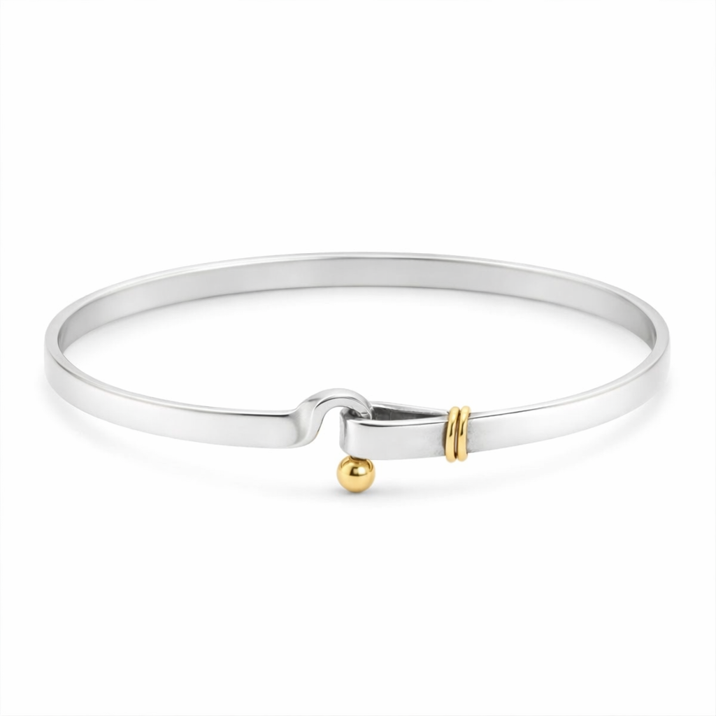 Ett elegant och minimalistiskt armband från Tiffany & Co. med ett karakteristiskt hook-lås. Designen kombinerar en slät silvrig bangle med exklusiva gulddetaljer i 18k.